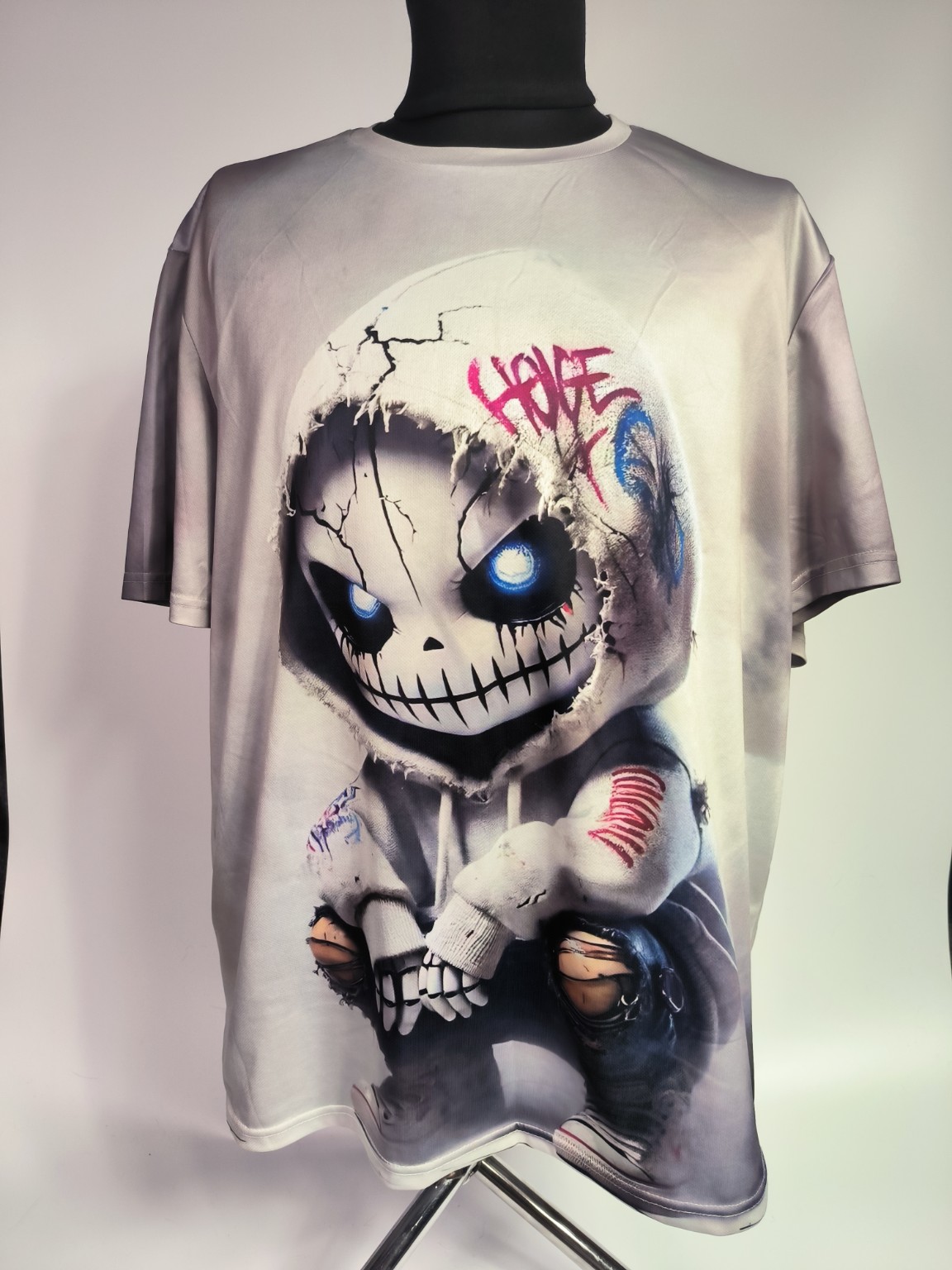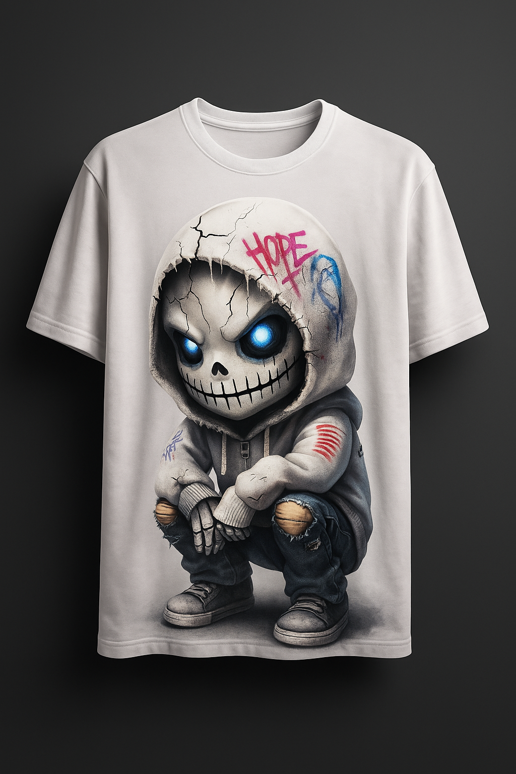 3D футболка «Street Skull» — це унікальний елемент гардеробу, створений для прихильників сучасної вуличної моди та яскравих образів. Її головна родзинка — деталізований принт із персонажем у стилі стріт-арту: тріщини на масці-черепі, неоново-блакитні очі та графіті-надписи створюють виразний образ, який одразу приковує погляд. Це футболка для тих, хто хоче заявити про себе та не боїться бути у центрі уваги.