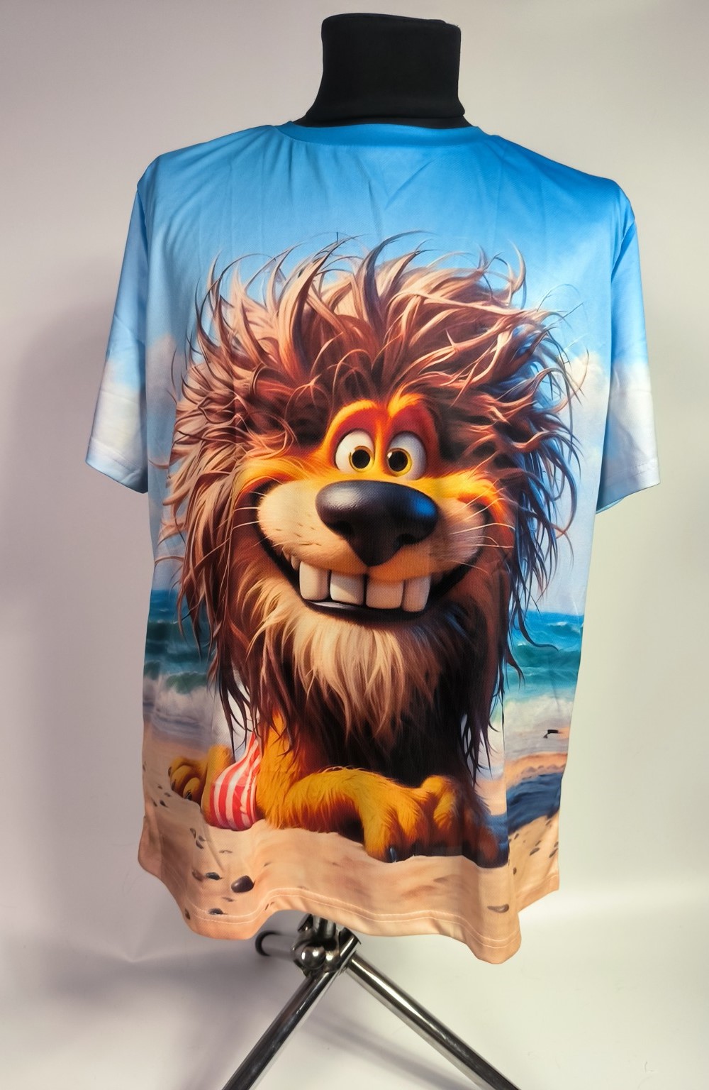 Дизайн футболки виконаний у яскравих літніх відтінках. Кумедний лев із розпатланою гривою та широкою усмішкою створює відчуття радості й безтурботності. Такий принт чудово підходить для літніх прогулянок, поїздок на море чи активного відпочинку. Лев, намальований у мультяшному стилі, додає образу жвавості та робить футболку справжнім центром уваги.