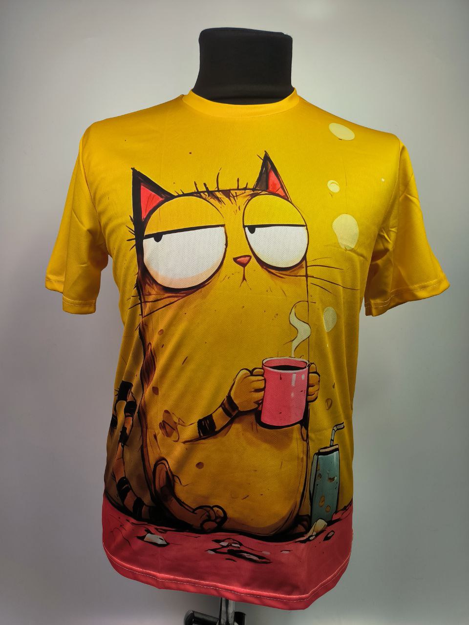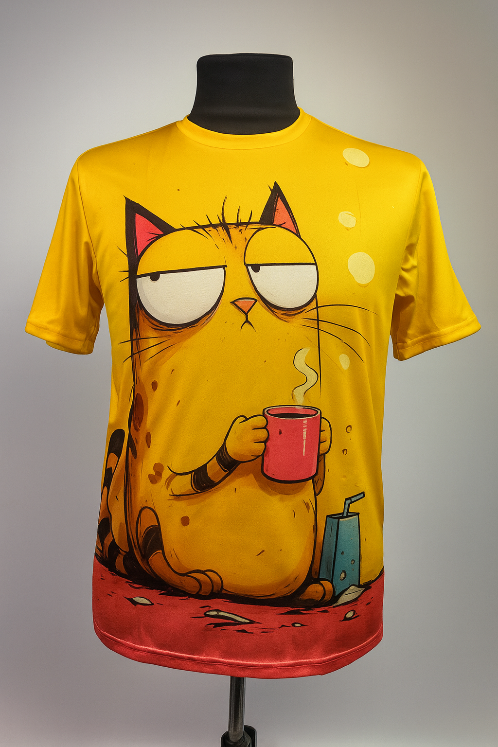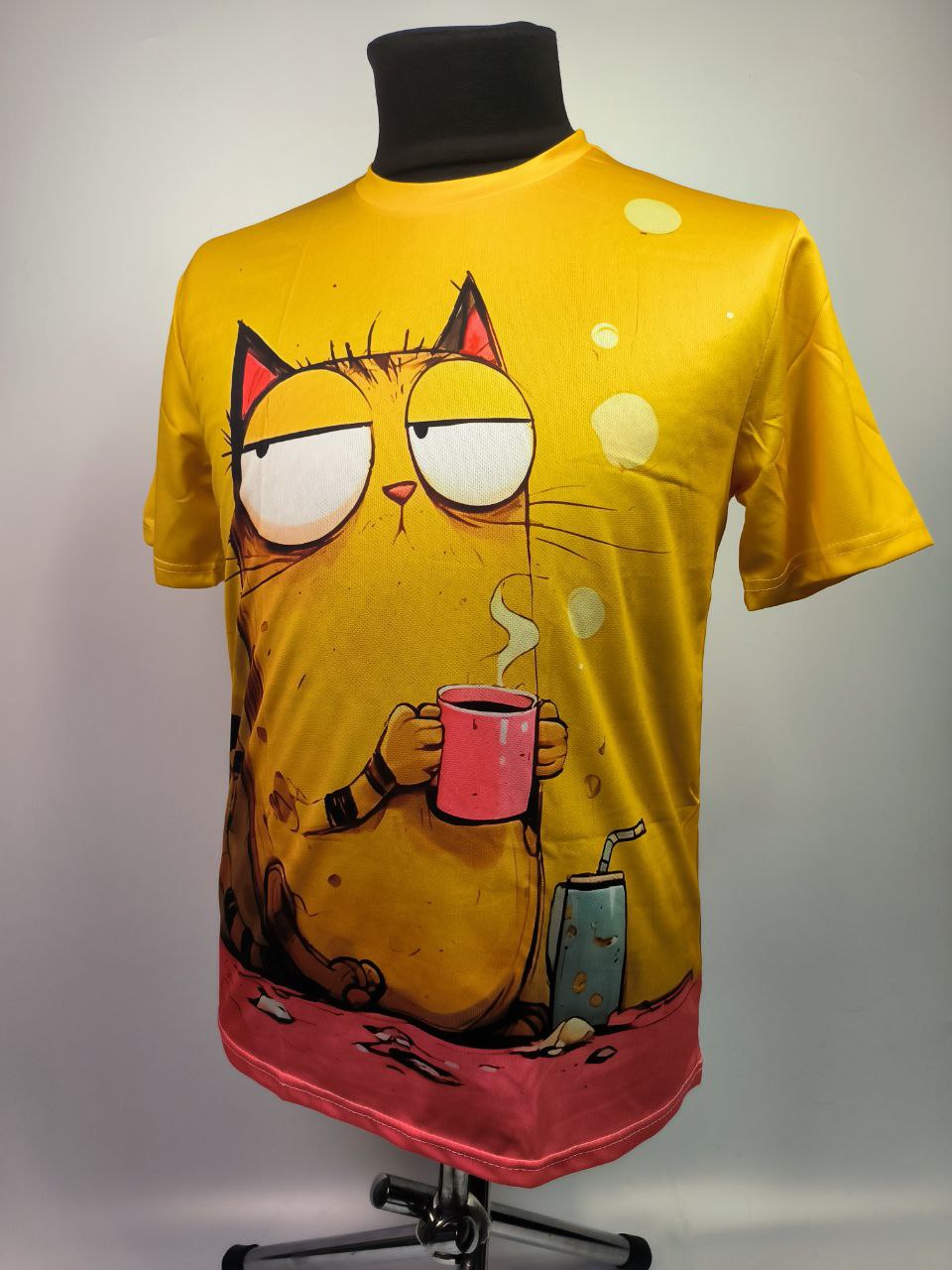 Футболка Lazy Cat — це вибух позитиву й затишку в одному одязі! Головний герой принта — кумедний кіт із втомленим поглядом і чашкою гарячої кави — стане улюбленцем усіх, хто любить починати день зі сміху. Яскравий жовтий фон із грайливими деталями створює чудовий настрій і додає енергії.