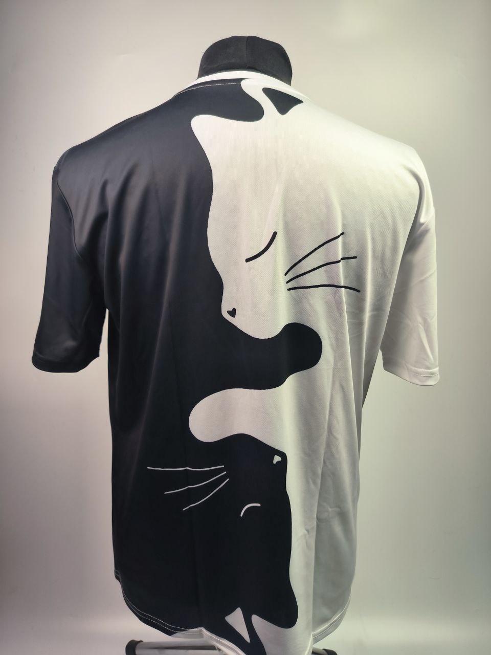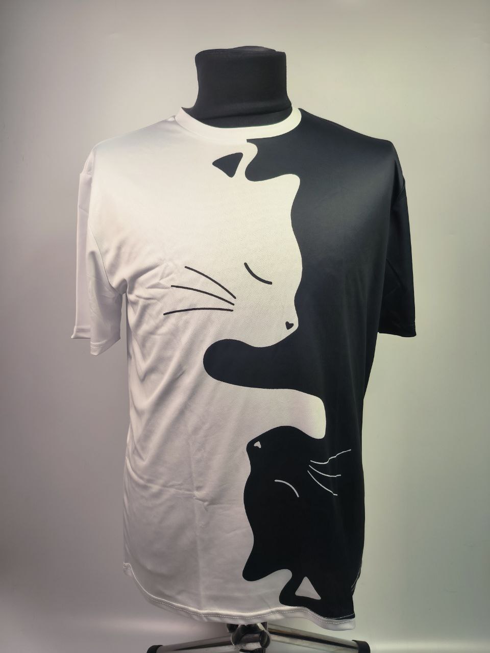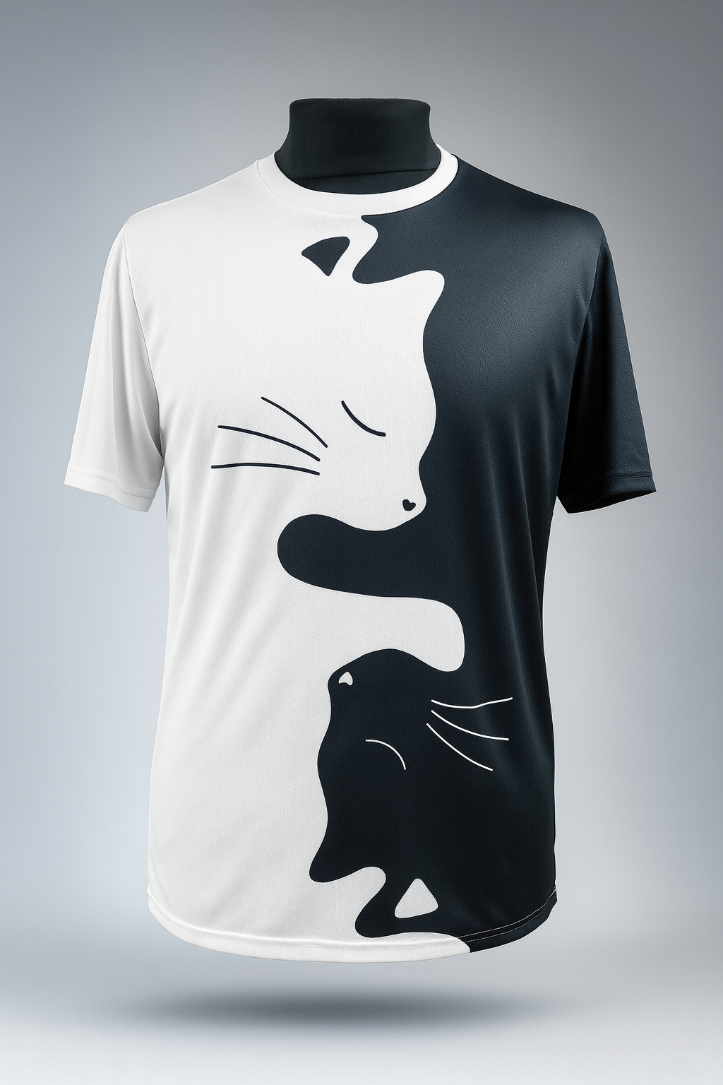 Футболка Yin-Yang Cats — це поєднання мінімалізму, комфорту та глибокого змісту. Стильний принт із двома котами у формі інь-янь символізує гармонію світла й темряви, створюючи оригінальний акцент у вашому образі. Виготовлена з поліестеру зі спортивною сіткою, вона забезпечує чудову вентиляцію навіть під час інтенсивних тренувань. Матеріал не втрачає кольору, не розтягується і не зсідається після прання — ідеальний вибір для активного способу життя.