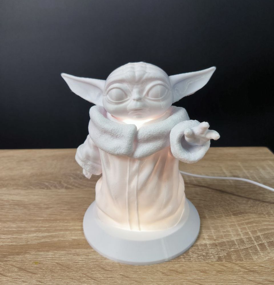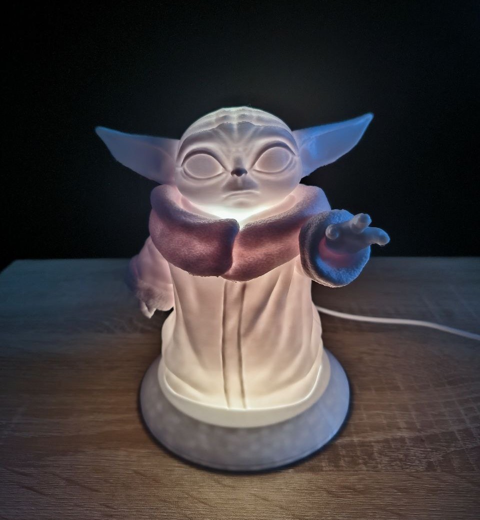 Світильник виготовлений з білого напівпрозорого PLA-пластику за технологією 3D-друку, що дозволяє світлу м’яко проходити крізь фігуру. У темряві Грогу немов оживає, випромінюючи тепле й заспокійливе світло — ідеально для вечірнього затишку, дитячої кімнати чи просто як декор для фаната Star Wars.